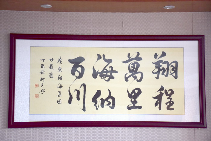 “翔程万里,海纳百川”,佛山市著名书法家亲自提笔,祝贺广东翔海集团20周年庆典。